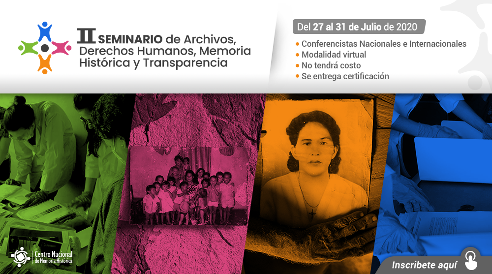 La Dirección de Archivo de los Derechos Humanos del Centro Nacional de Memoria Histórica invita a las víctimas, organizaciones de víctimas, sociedad civil y entidades públicas y privadas a participar en el II Seminario de Archivos, Derechos Humanos, Memoria Histórica y Transparencia, que se llevará a cabo del 27 al 31 de julio.